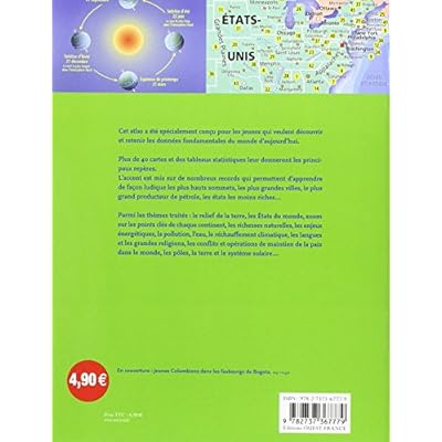 Un Atlas conçu pour les 6-14 ans avec les repères fondamentaux du monde d'aujourd'hui - Le monde physique et le monde politique (relief, sommets, fleuves, langues, religions...) - 16 cartes thématiques mondiales (population, richesses naturelles, natalité, conflits, les enjeux énergétiques, la pollution, les ressources en eau...) - L'Union Européenne - La France physique et politique - 4 pages sur les drapeaux du monde