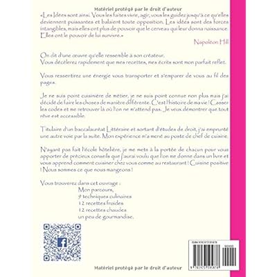 "Les idées sont ainsi, vous les faites vivre, agir, vous les guidez jusqu'à ce qu'elles deviennent puissantes et balaient toute opposition. Les idées sont des forces intangibles mais elles ont plus de pouvoir que le cerveau qui leur donna naissance. Elles ont le pouvoir de lui survivre" Napoleon Hill On dit d’une œuvre qu’elle ressemble à son créateur. Vous décèlerez rapidement que mes recettes, ma cuisine et mes écrits sont mon parfait reflet. Vous ressentirez une énergie vous transporter et s’emparer de vous au fil des pages. Je ne suis point cuisinière de métier, je ne suis point connue non plus mais j’ai décidé de faire les choses de manière différente. C’est l’histoire de ma vie ! Casser les codes et me retrouver là où l’on ne m’attend pas. Je eux démontrer que tout rêve est accessible. Titulaire d’un baccalauréat Littéraire et sortant d’études de droit, j’ai emprunté une autre voie par la suite. Mon expérience m’a mené au poste de chef de cuisine. N’ayant pas fait l’école hôtelière, je me mets à la portée de chacun pour vous apporter de précieux conseils que j’aurai voulu que l’on me donne dans un livre et vous apprend comment cuisiner chez vous comme au restaurant ! Cuisine positive ! Nous sommes ce que nous mangeons ! Vous trouverez dans cet ouvrage : Mon parcours, 9 techniques culinaires/ 12 recettes froides/ 12 recettes chaudes et un peu de gourmandise.